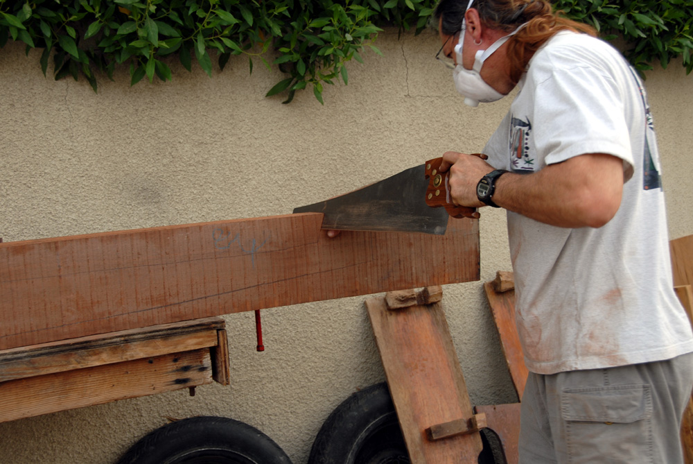 Arch taillant les pièces d'acajou pour la quille, après les avoir marquées selon le patron. After marking the mahogany pieces from the template, the mahogany is cut on the bandsaw |