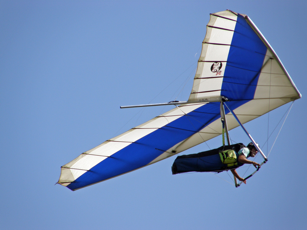 | Des dizaines de gars se lancent du haut de la colline en delta-plane ou en parapente. Several guys are launching themselves from the top of the hill. | |