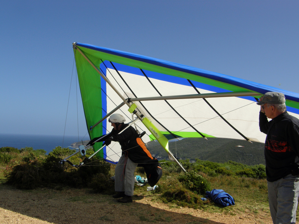 | En fin d'après-midi nous sommes de retour à Shelley Beach pour nous apercevoir que c'est un site de vol libre ! In late afternoon we're back at Shelley Beach, just to notice that this place is a hand gliding and para-sailing site ! | |