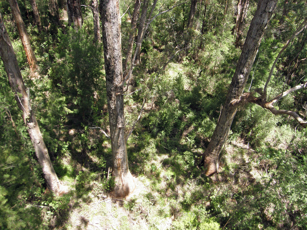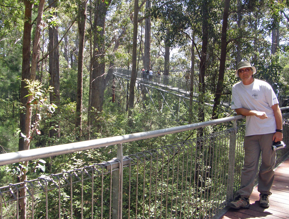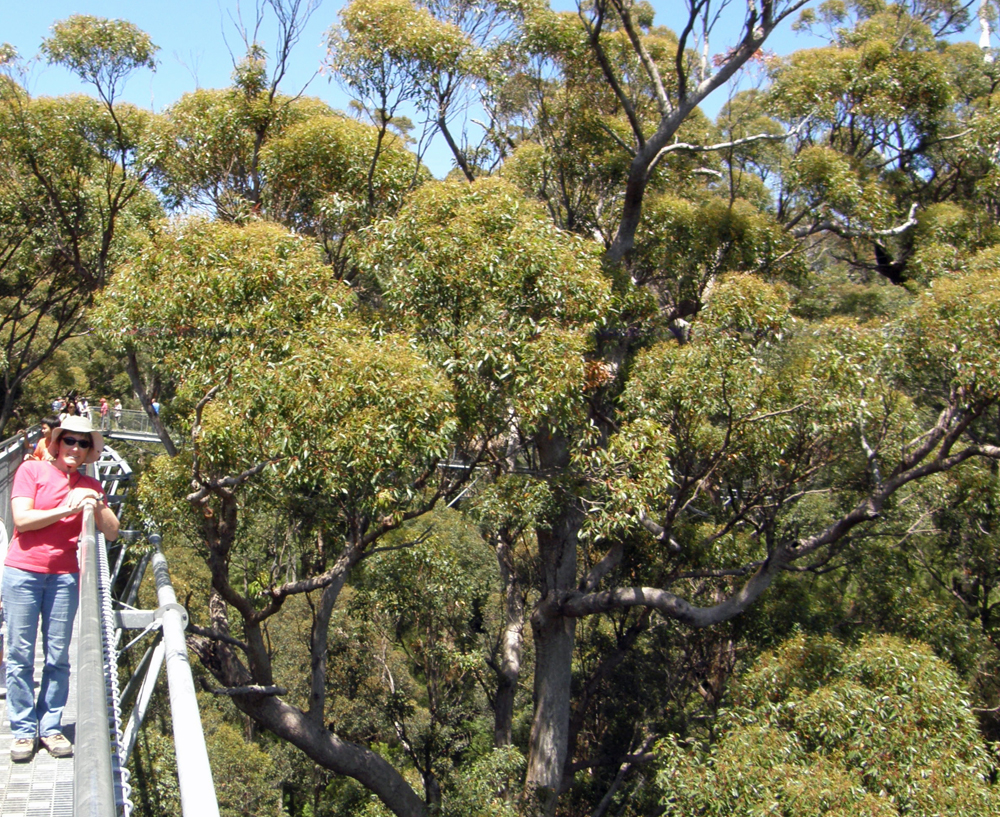 | La passerelle nous emmène en effet jusqu'à la cime de ces majestueux eucalyptus. The footbridge is bringing us to the very top of these majestic Red Tingle trees (Eucalyptus Jacksonii). | |