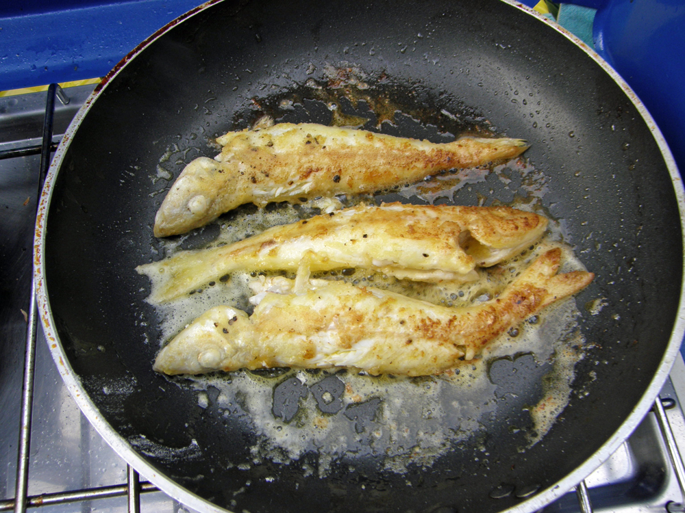 | Un voisin pêcheur nous a donné ces petits poissons, appelés "whitings", qui ressemblent étrangement à nos éperlans québécois, mais en plus blanc ! On les a fait cuire au déjeuner. A neighbour who went fishing gave us these small fishes, called "whitings" (guess why?)... They look quite like the smelts we have in Québec, except that they are white ! We cooked them for breakfast. | |