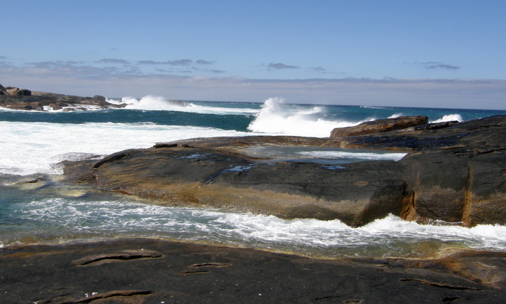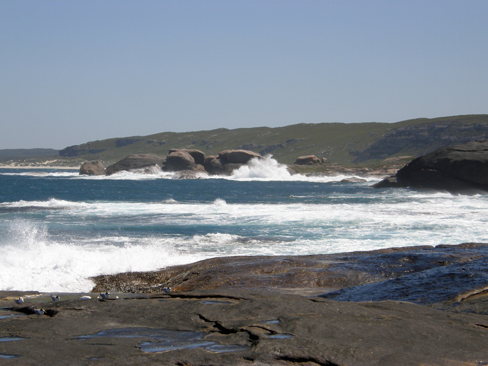 autour du monde, avec le Cap de Bonne Espérance et le Cap Horn. C'est le Cap Leeuwinn ! This rocky shore is one of the three mythical capes of the round the world sailing races, with Cape of Good Hope and Cape Horn. This is Cape Leeuwinn ! |