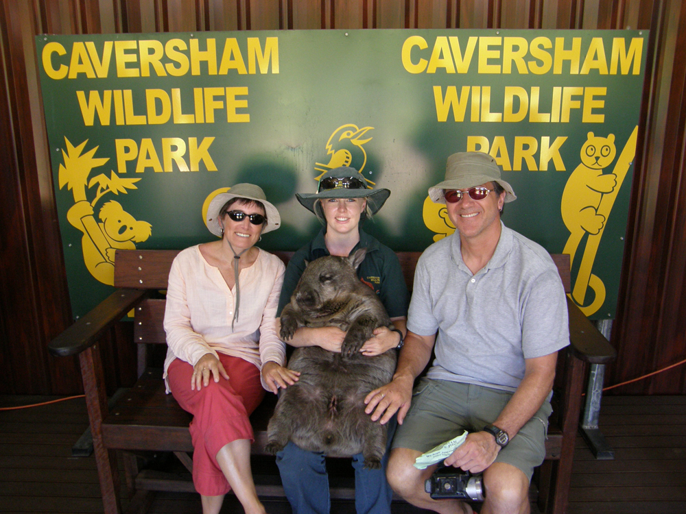 | Le Caversham Wildlife Park, situé à l'intérieur de Whiteman Park, héberge une des plus grandes collections d'animaux natifs d'Australie. Caversham Wildlife Park, situated in Whiteman Park, houses one of the largest collections of native fauna. | Nous voici en compagnie de la mascotte du parc: un wombat. Here we are in company of the park's mascot: a wombat. |