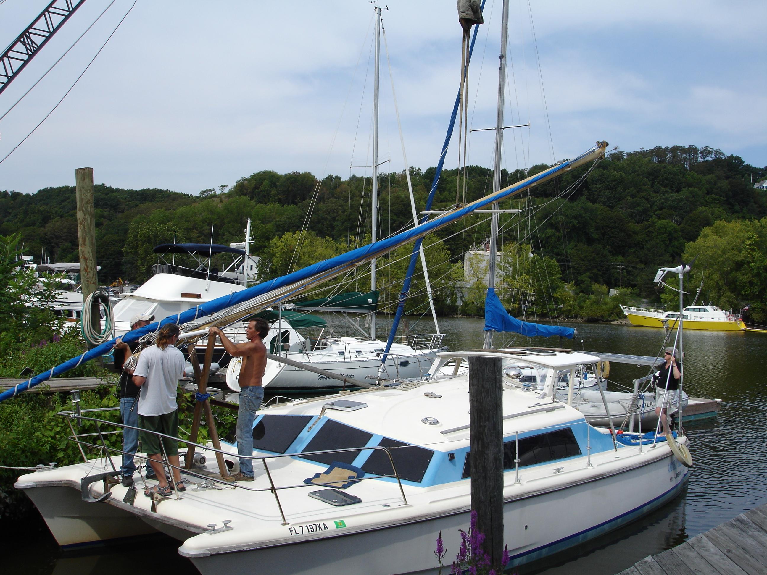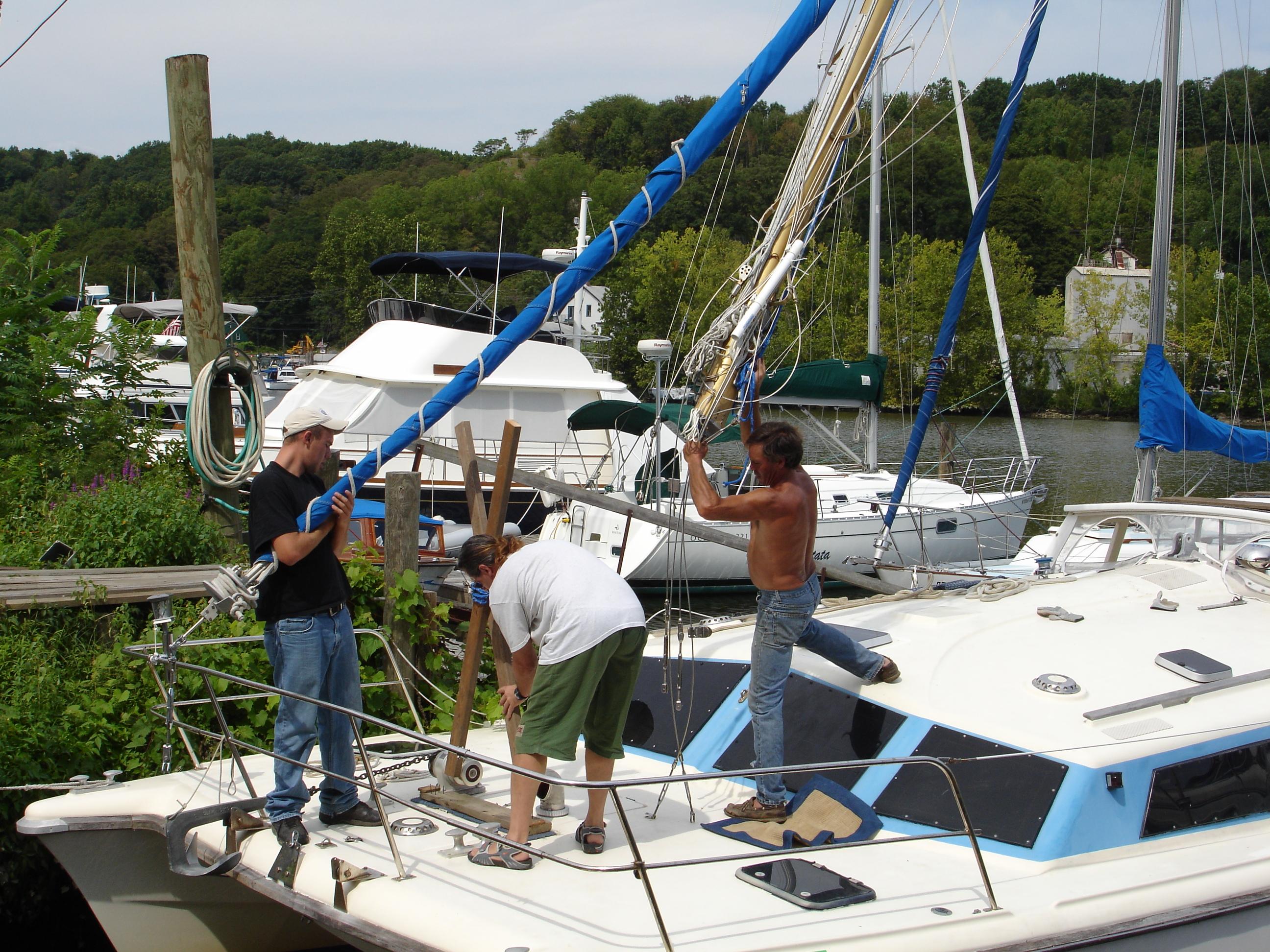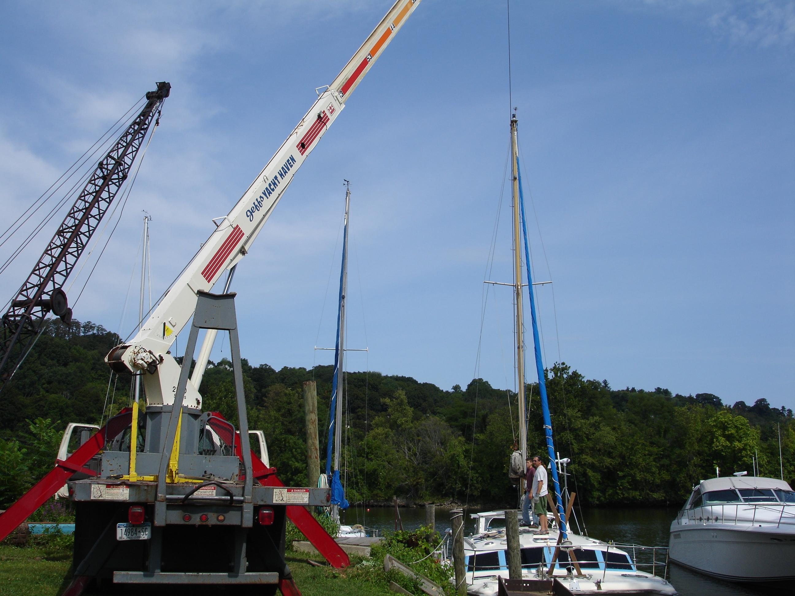 Sean lifted the mast with the crane. They were three on the