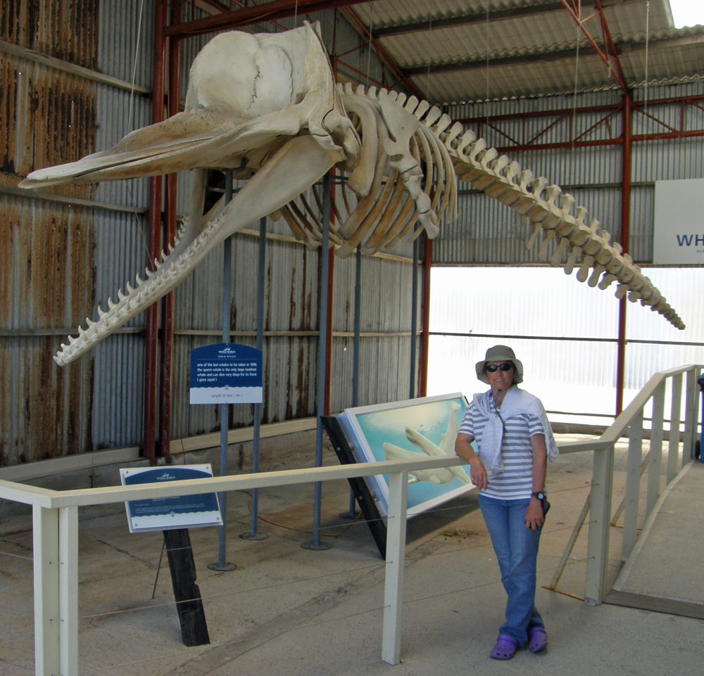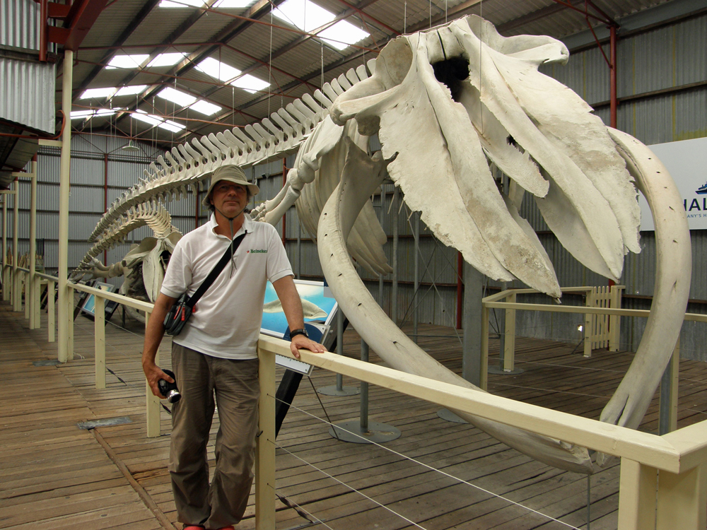 | Lise devant le squelette du dernier cachalot chassé à Albany en 1978. Lise in front of the skeleton of the last Sperm Whale taken in Albany in 1978. | Marc devant le squelette d'une baleine bleue de 22 mètres de long ! Marc in front of the skeleton of a 22 meters long Blue Whale. |