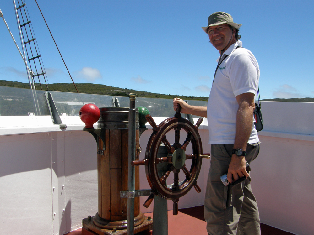| Le harpon à la proue du bateau. The harpoon at the bow of the boat. | Marc à la barre. Marc at the helm. |