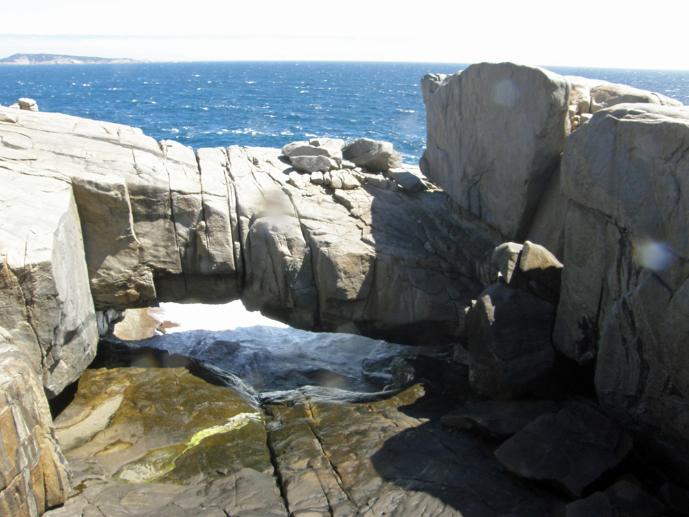 | Au sud d'Albany, dans le Torndirrup National Park: un rocher formant un "pont naturel". South of Albany, in the Torndirrup National Park: a rock in the shape of a "natural bridge". | Sur ces falaises, le vent sculpte le paysage. On these cliffs, the wind sculpts the landscape. |