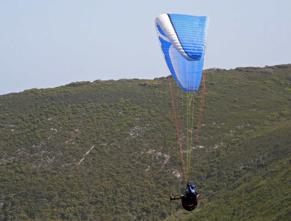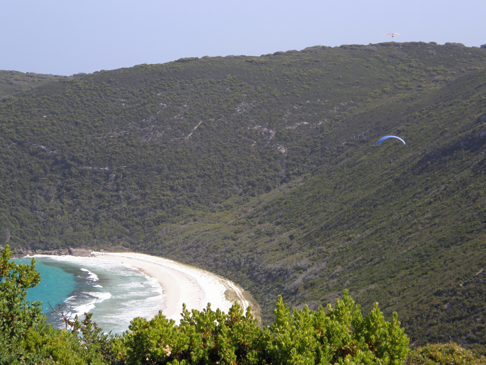 | En fin d'après-midi nous sommes de retour à Shelley Beach pour nous apercevoir que c'est un site de vol libre ! In late afternoon we're back at Shelley Beach, just to notice that this place is a hand gliding and para-sailing site ! | |