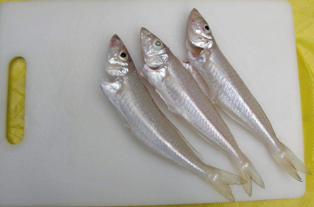 | Un voisin pêcheur nous a donné ces petits poissons, appelés "whitings", qui ressemblent étrangement à nos éperlans québécois, mais en plus blanc ! On les a fait cuire au déjeuner. A neighbour who went fishing gave us these small fishes, called "whitings" (guess why?)... They look quite like the smelts we have in Québec, except that they are white ! We cooked them for breakfast. | |
