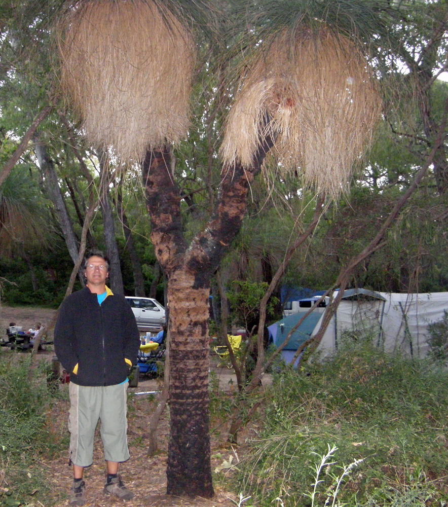 | On les appelle "grass trees". Il en existe 28 espèces en Australie dont certaines peuvent vivre jusqu'à 600 ans ! Celui-ci a certainement connu un feu de forêt. We call them "grass trees". There are 28 species in Australia and some of them can live up to 600 years. This one has certainly been through a forest fire. | Cette