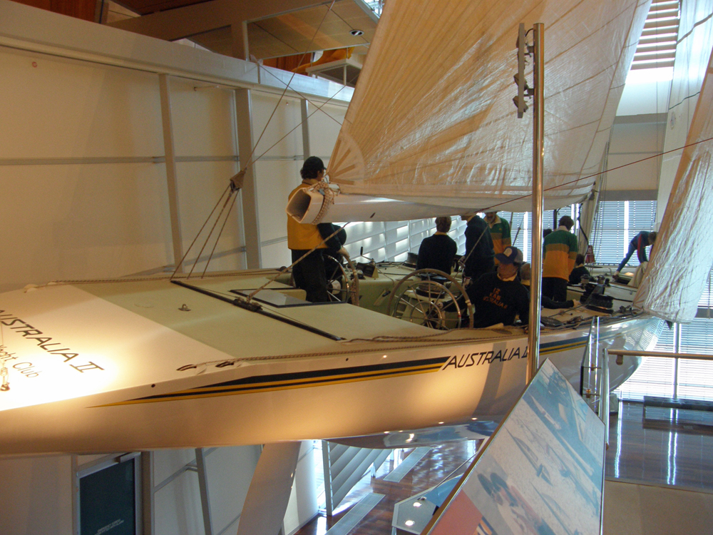 voile sans escale, 71 023 milles parcourus en 657 jours de mer. Parry Endeavour, Jon Sanders's sailboat. This Australian mythical sailor who completed three non-stop solo circumnavigations in 1988. 71 023 miles in 657 days at sea. | Et voici le fameux Australia II, le voilier qui a ravi la Coupe de l'America en 1983, après 132 ans de domination américaine. And here is the famous Australia II, the sailboat that won the America's Cup in 1983, after 132 years of American domination. |