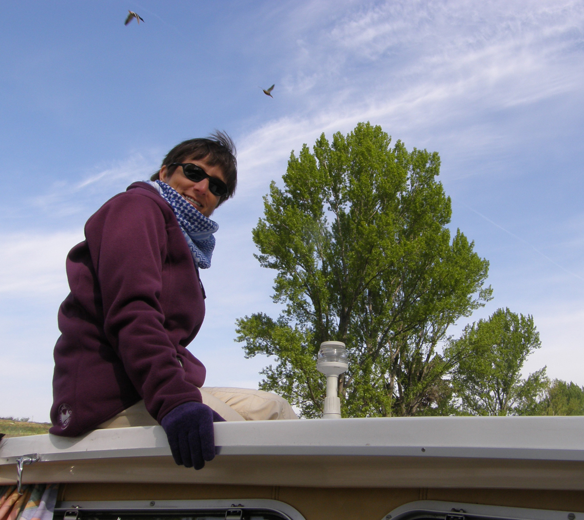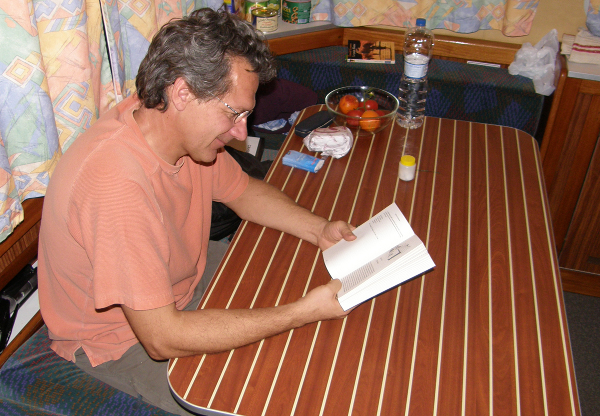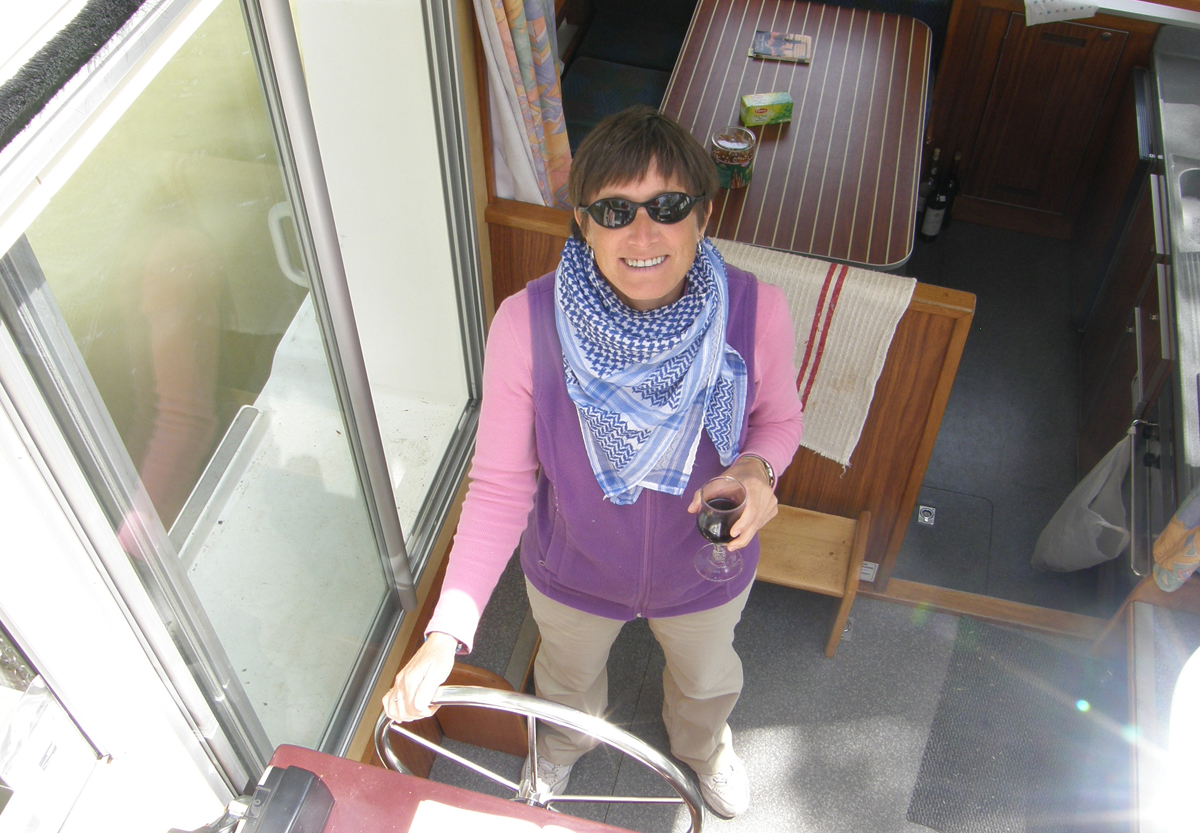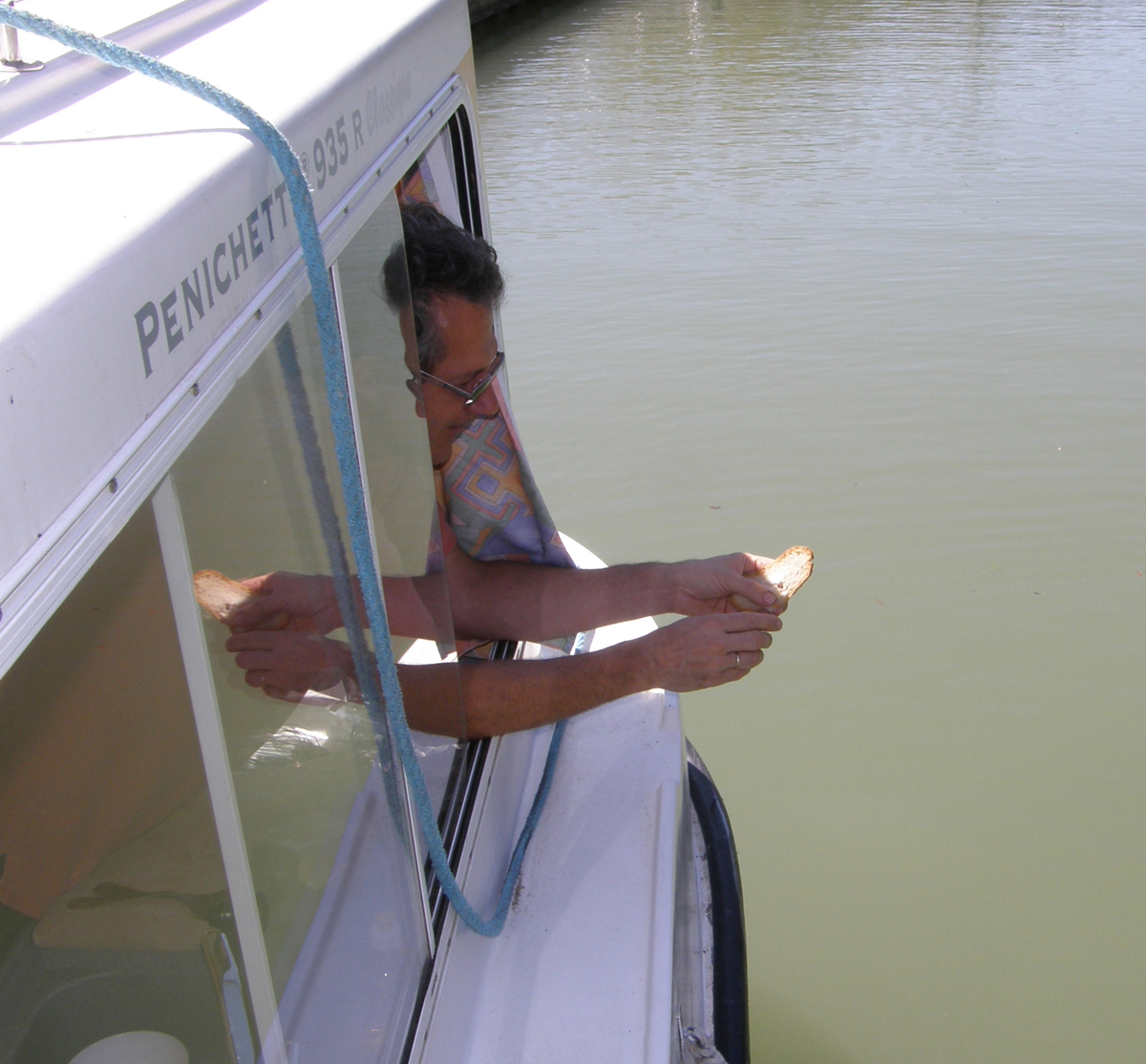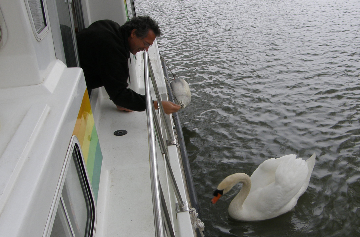 Lise is at the helm while Marc is feeding a swan. |