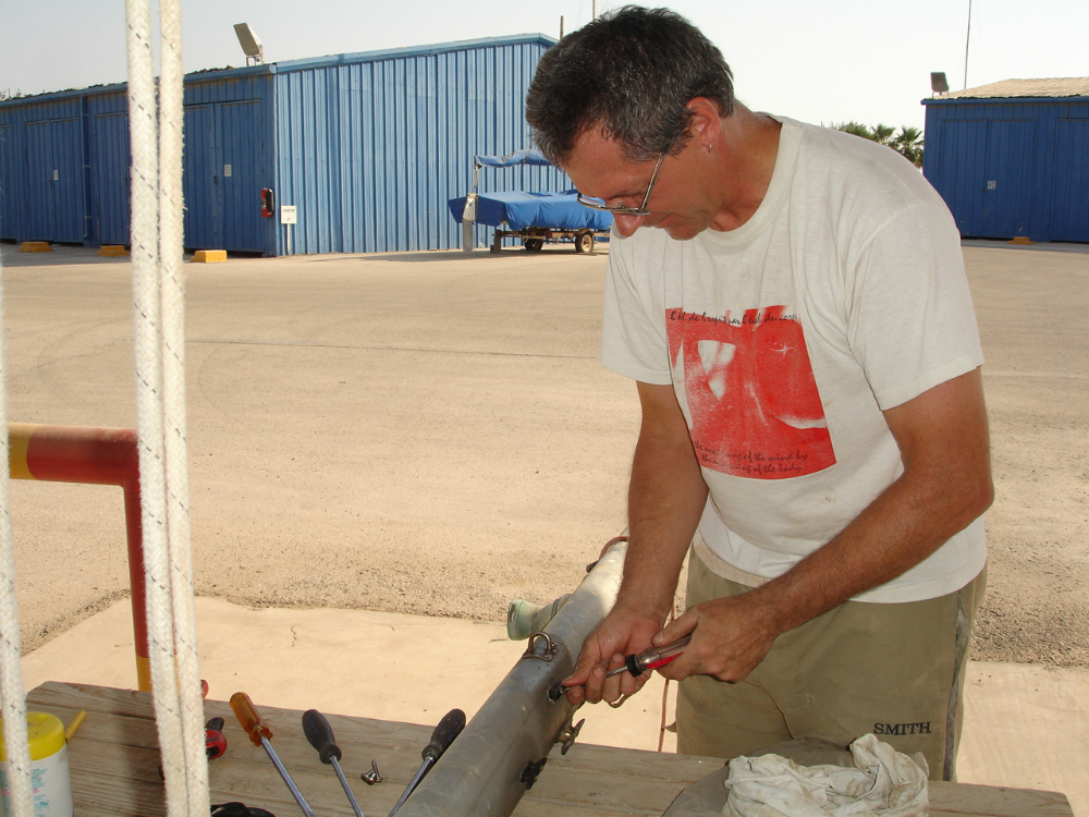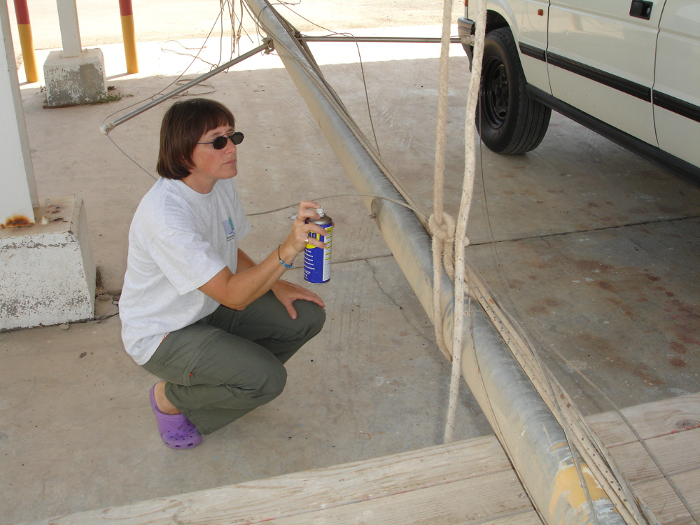 Here, Lise is spraying WD40 on all the screws and bolts along the mast in order to take them off easily. |