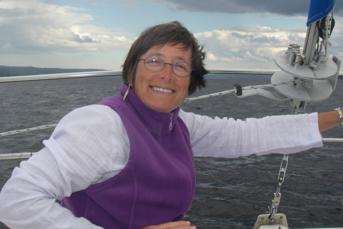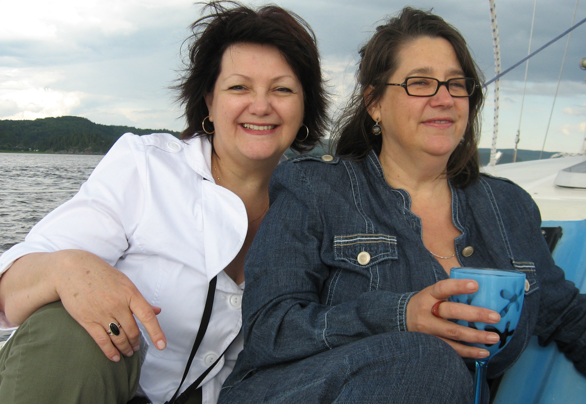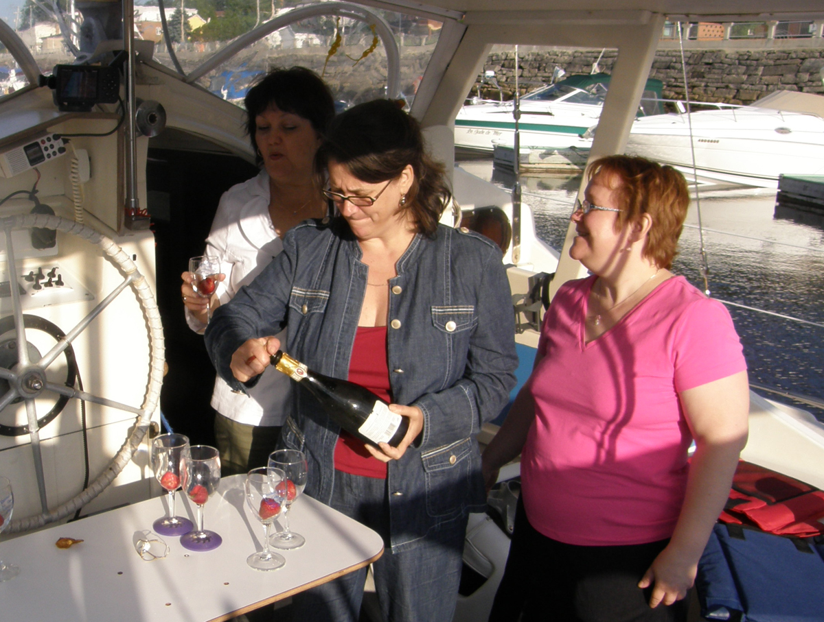 | Luc, le chum d'Aline, renoue avec la voile. Luc, Aline's boyfriend used to sail long time ago. | Lise est bien heureuse d'accueillir ses amies à bord. Lise is very happy to welcome her friends aboard. |