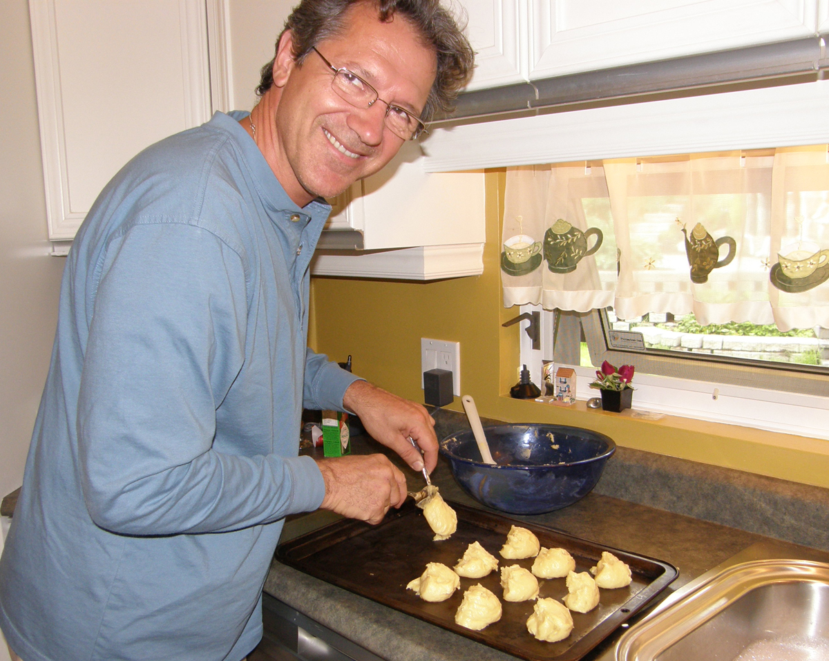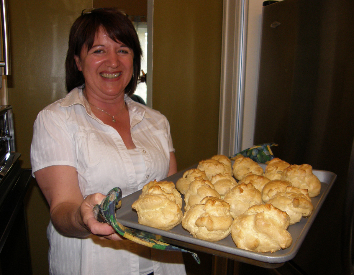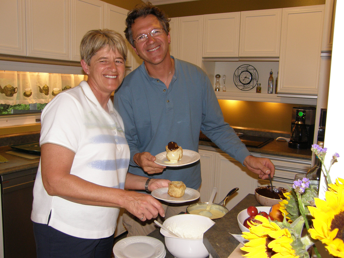 | Marc toujours heureux de cuisiner ses choux à la crème. Marc is always happy to bake his cream puffs. | C'est Louise qui offre sa cuisine pour le repas. It's Louise who welcomes us in her kitchen. |