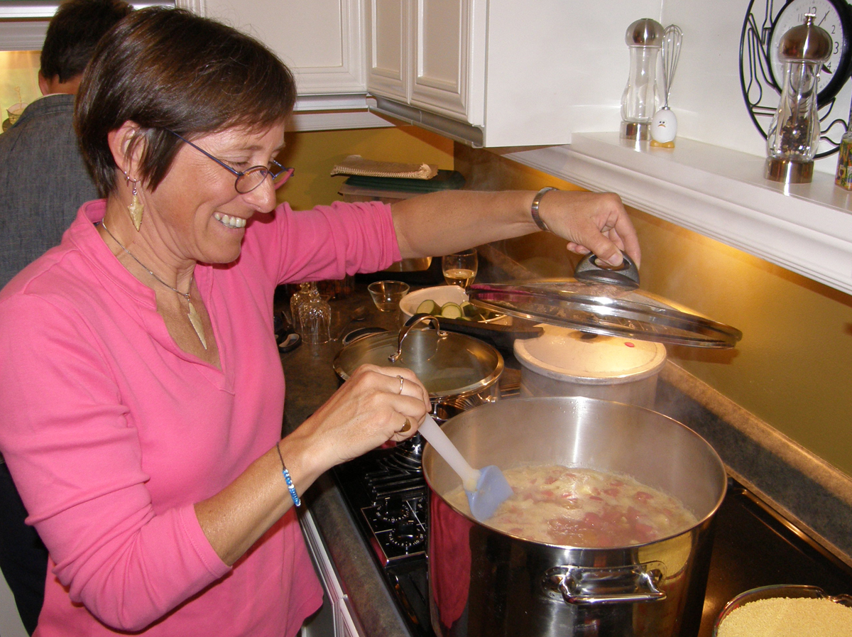 | Lise préparant le bouillon du couscous. Lise preparing the couscous stock. | |