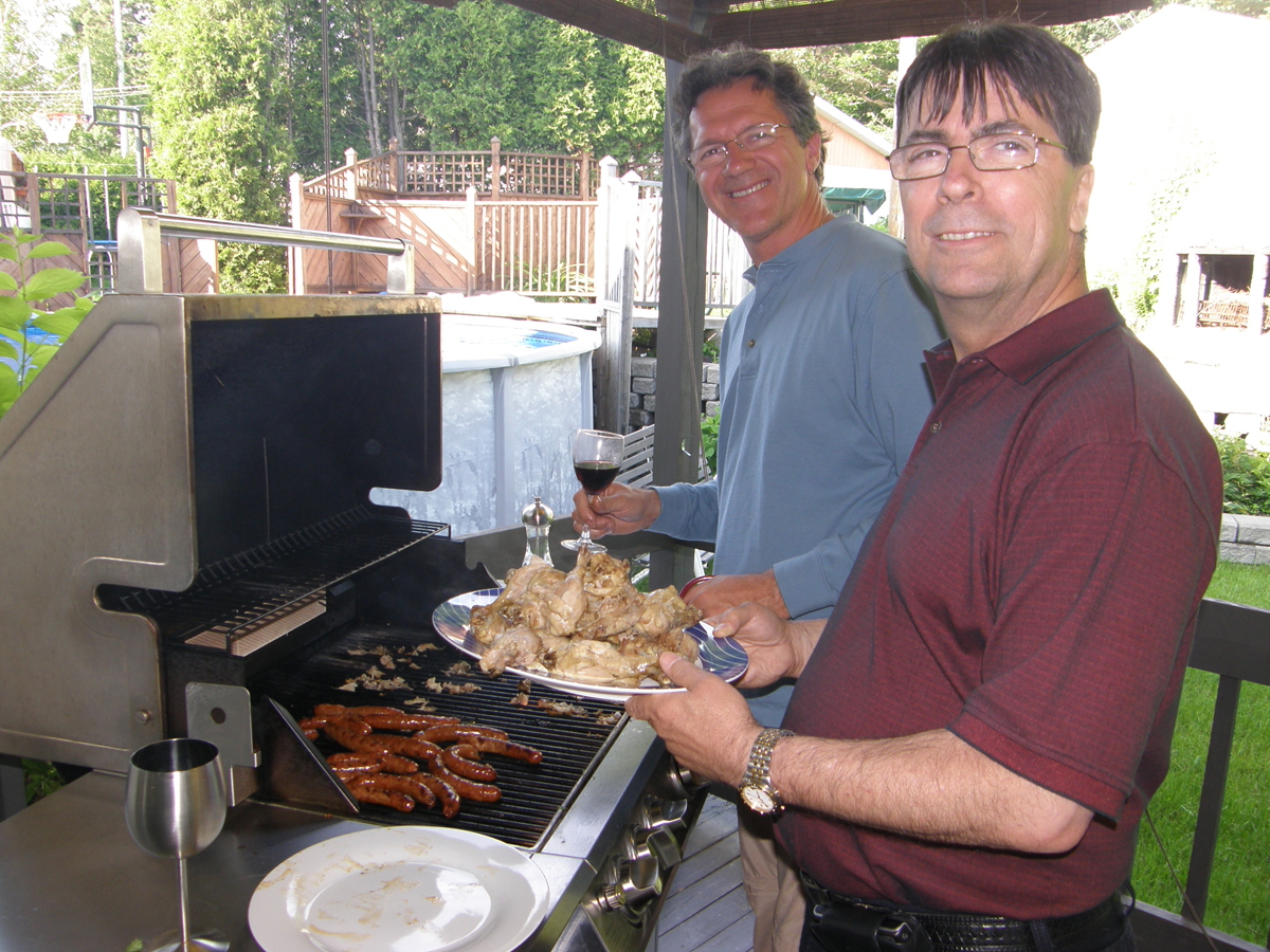 Marc à la cuisson des viandes, assisté de Normand Marc is cooking the meats, helped by Normand | |