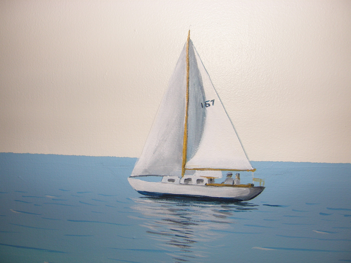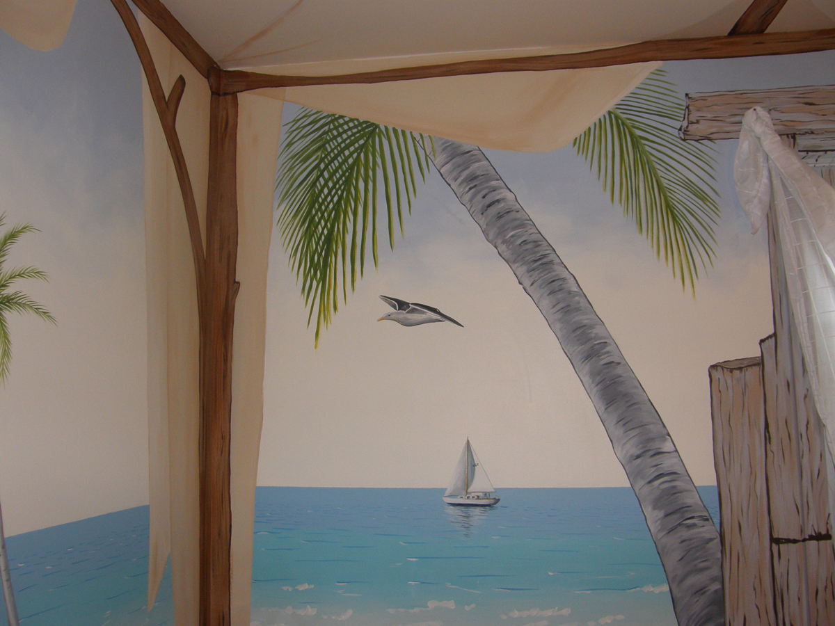 | Notre amie Doris nous a invités sur son île déserte. Eh oui, elle a peint sa salle à manger comme si nous étions au milieu d'une île déserte sous un abri de fortune. L'effet est très réussi. Our friend Doris invited us on her desert island. Yep ! She has painted her dining room as if we were under a canvas shelter on a desert island. The effect is quite real. | Nous pouvons voir des palmiers, des oiseaux marins, et un voilier ! We can see palm trees, seabirds and a sailboat ! |