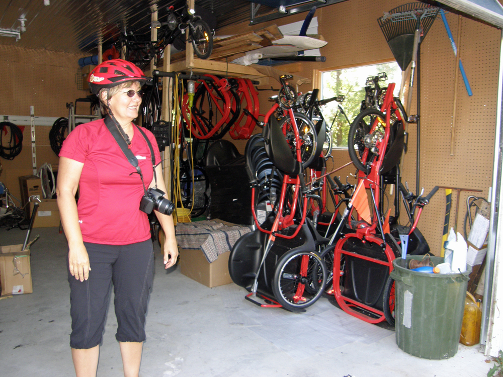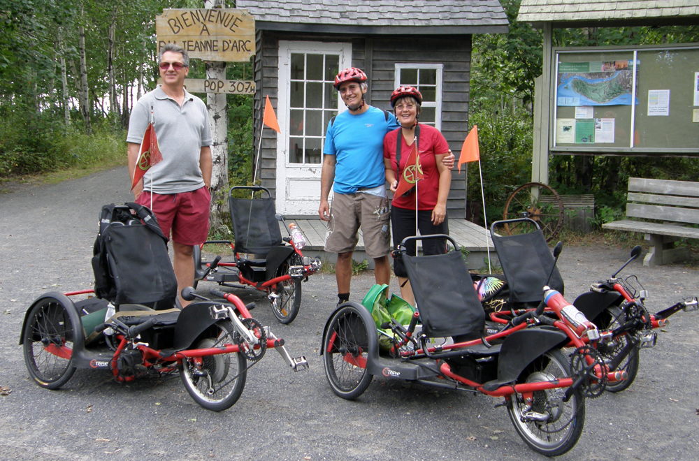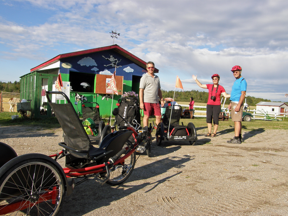 | Nous voici à Saint-Henri de Taillon, à faire du "TripodCycle" avec les concepteurs du vélo à trois roues, Marcel Mérette et Guylaine Niquet. Nous nous sommes payé des TriopodCycles en guise de cadeau de Noël. ;o) Here we are in Saint-Henri-de-Taillon riding our "TripodCycles" with the designers of this recumbent tricycle, Marcel Mérette and Guylaine Niquet. We bought ourselves those TripodCycles as Christmas gifts. :o) |
