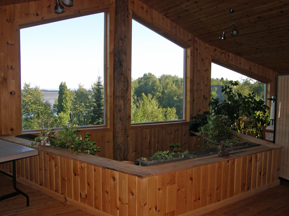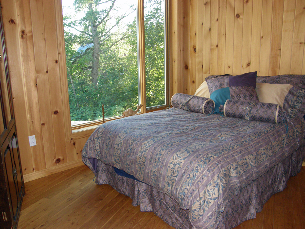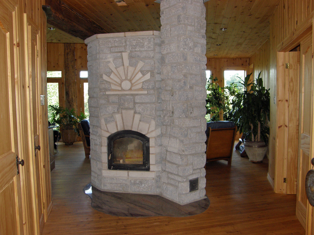 Le foyer de masse central est spectaculaire. The central masonry heater is spectacular. | À l'étage: Vue sur le Lac Saint-Jean. On the second floor: View on the Lake Saint-Jean. |
