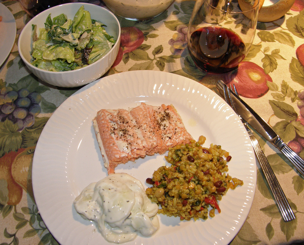 the menu: salmon fillet, cucumber salad, legumes salad and